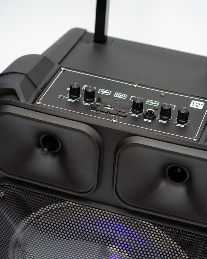 “Parlante portátil de 12” con Bluetooth, luces LED y micrófono inalámbrico. Potencia y sonido profesional para tus mejores momentos”