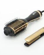 “Set profesional con plancha cerámica y cepillo modelador 2 en 1, para un cabello liso, brillante y sin friz.”